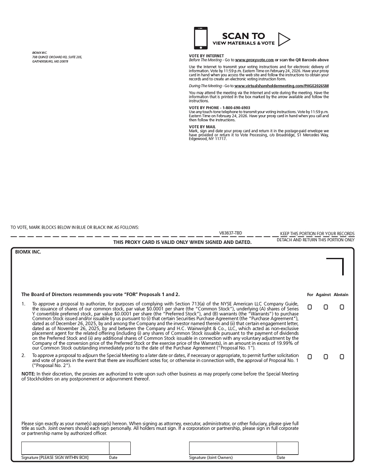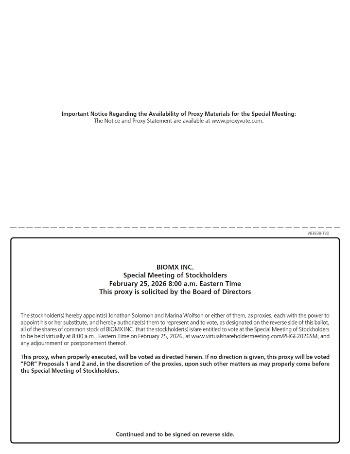 You are cordially invited to attend a Special Meeting of Stockholders (“Special Meeting”) of BiomX Inc. at 8:00 a.m., Eastern Time, on Wednesday, February 25, 2026. The Special Meeting will be held entirely online to allow for greater participation. Stockholders may participate in the Special Meeting by visiting the following hosting URL: https://www.virtualshareholdermeeting.com/PHGE2026SM.