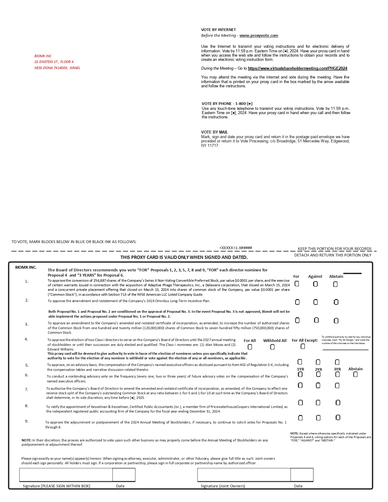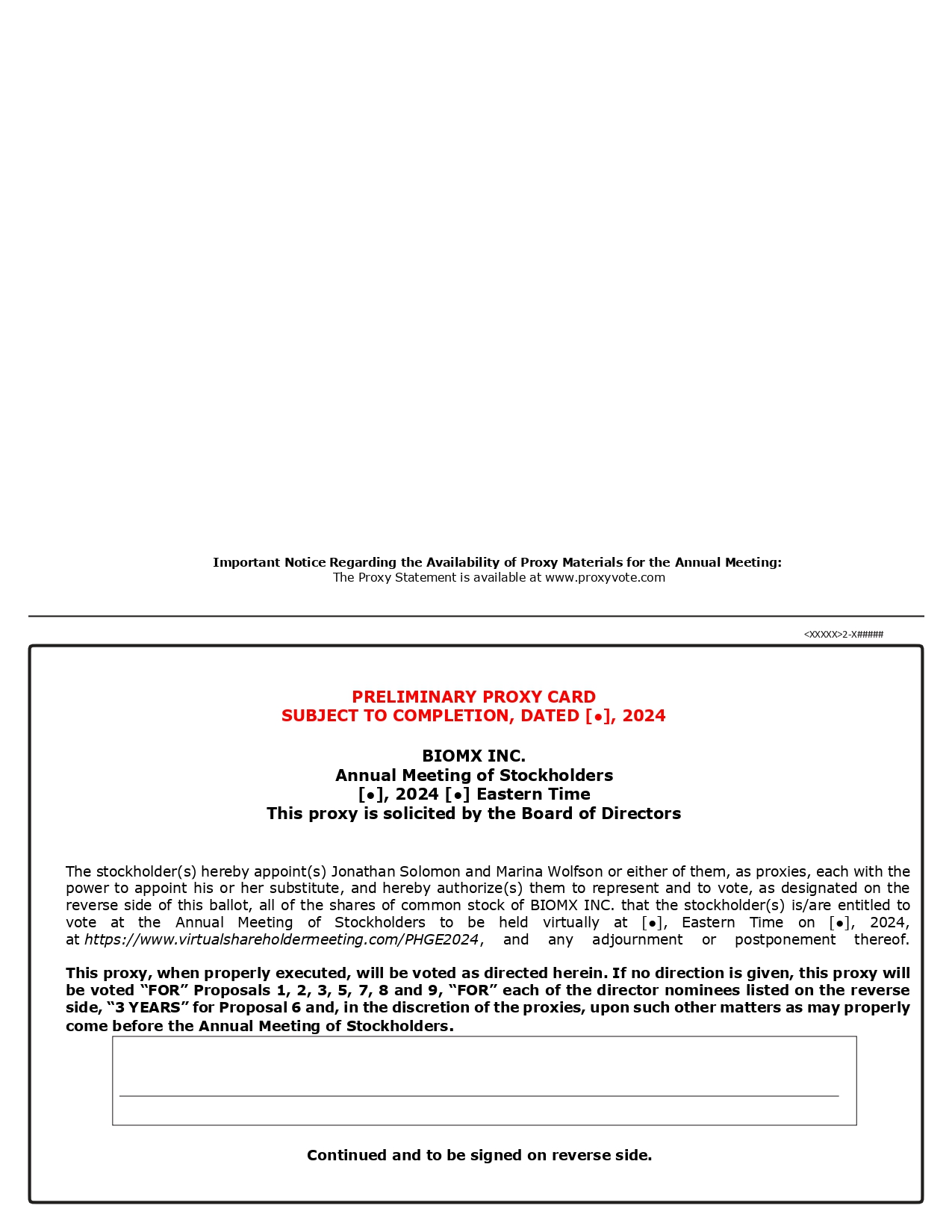 You are cordially invited to attend the 2024 Annual Meeting of Stockholders of BiomX Inc. at 8:00 a.m., Eastern Time, on [●], [●], 2024. This year’s Annual Meeting will be held entirely online to allow for greater participation. Stockholders may participate in this year’s annual meeting by visiting the following hosting URL: https://www.virtualshareholdermeeting.com/PHGE2024.